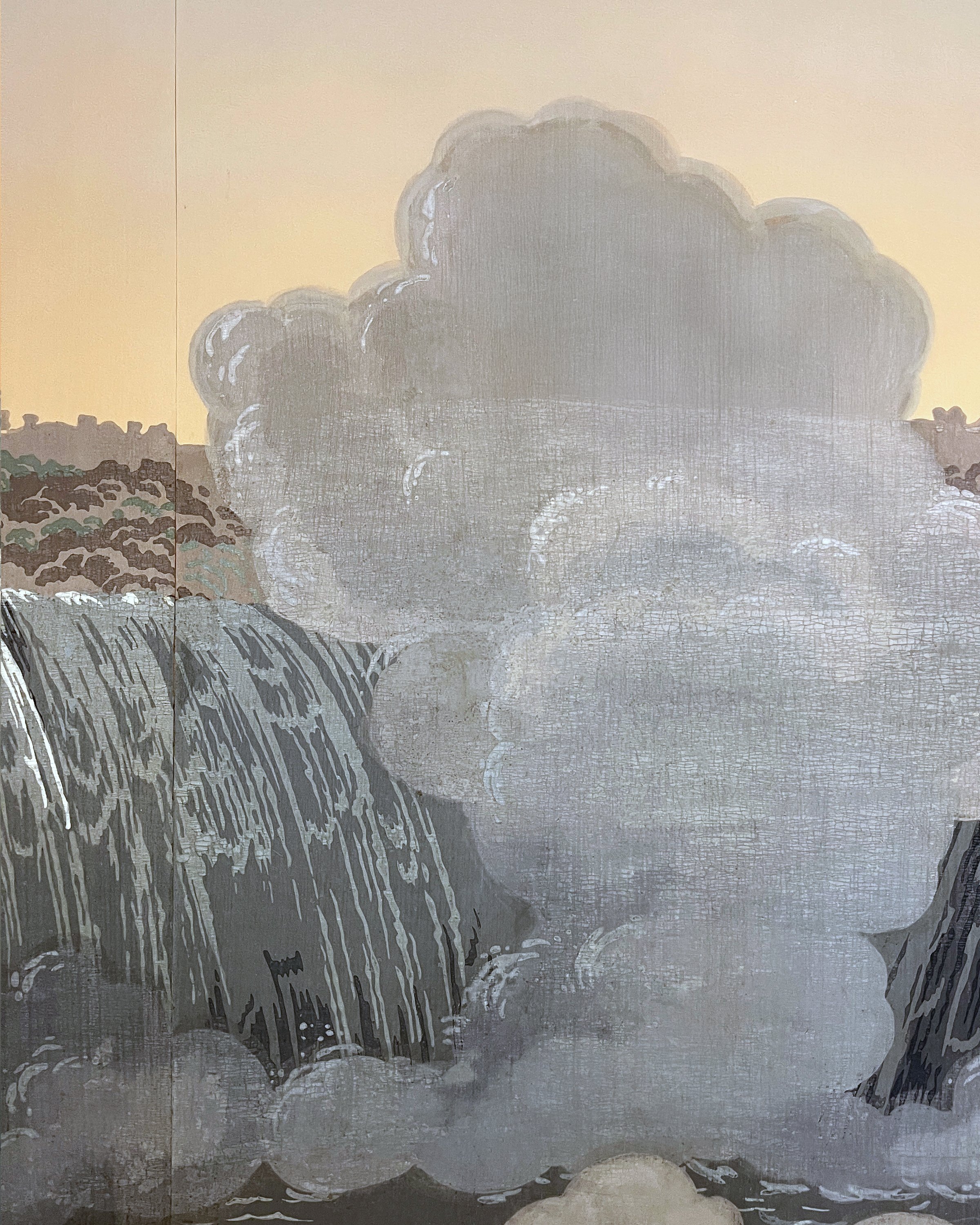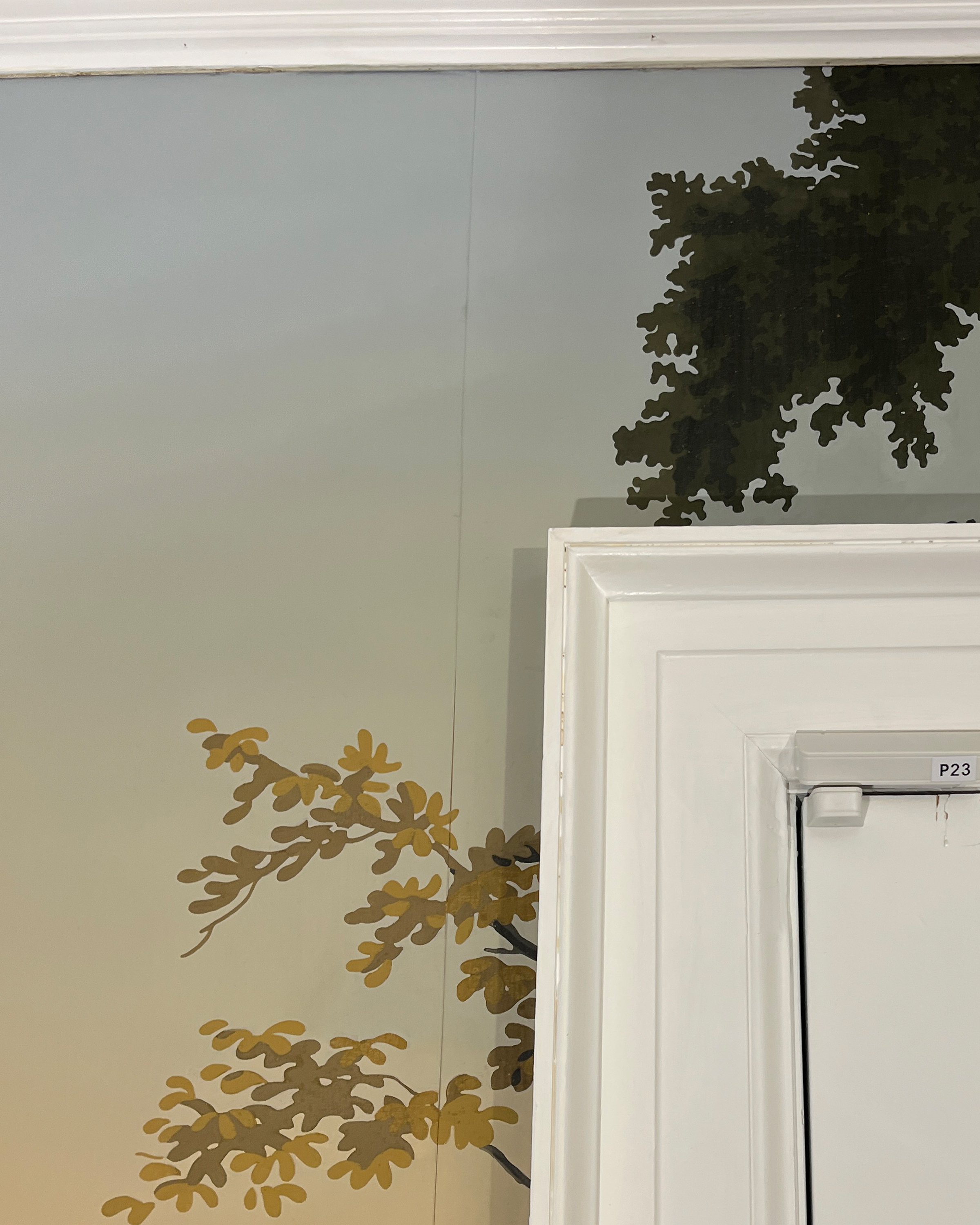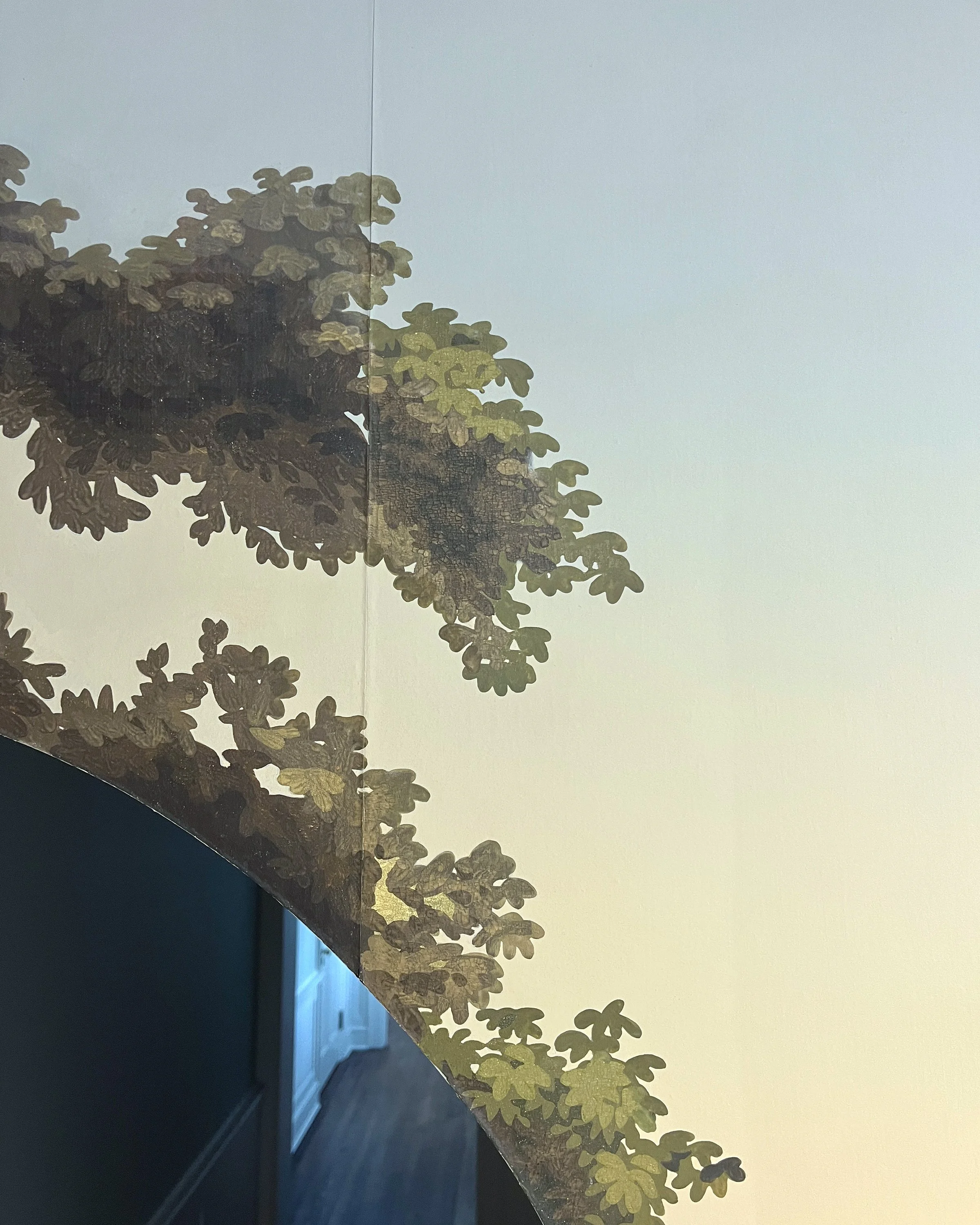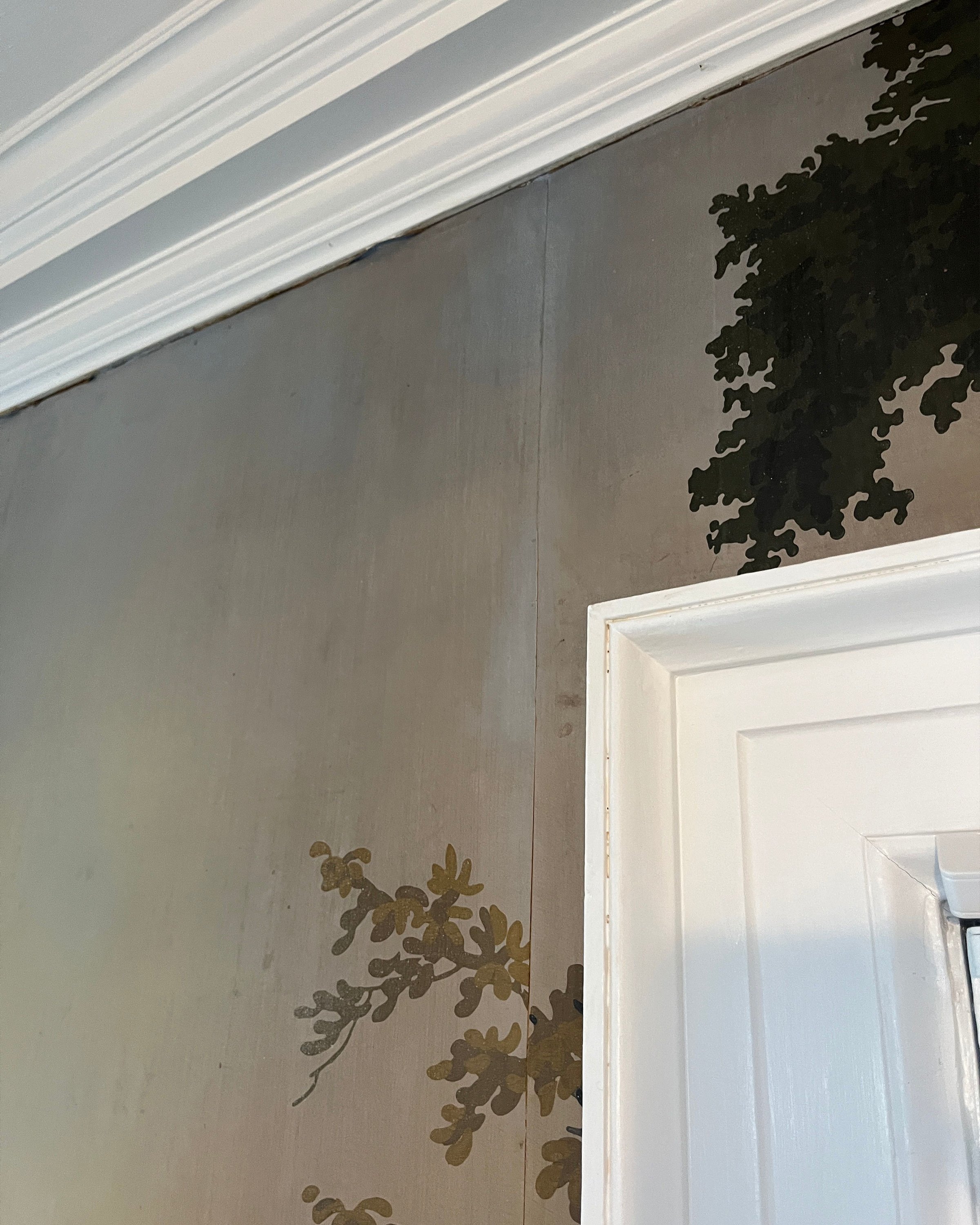 Over the decades, the wallpaper had accumulated layers of dirt and wear. Parts of the paper had begun to lift or crack, and there were numerous areas where the original paint had faded or flaked away. Once cleaned, we re-secured each delicate section by hand to stabilize the surface and prevent further damage.
